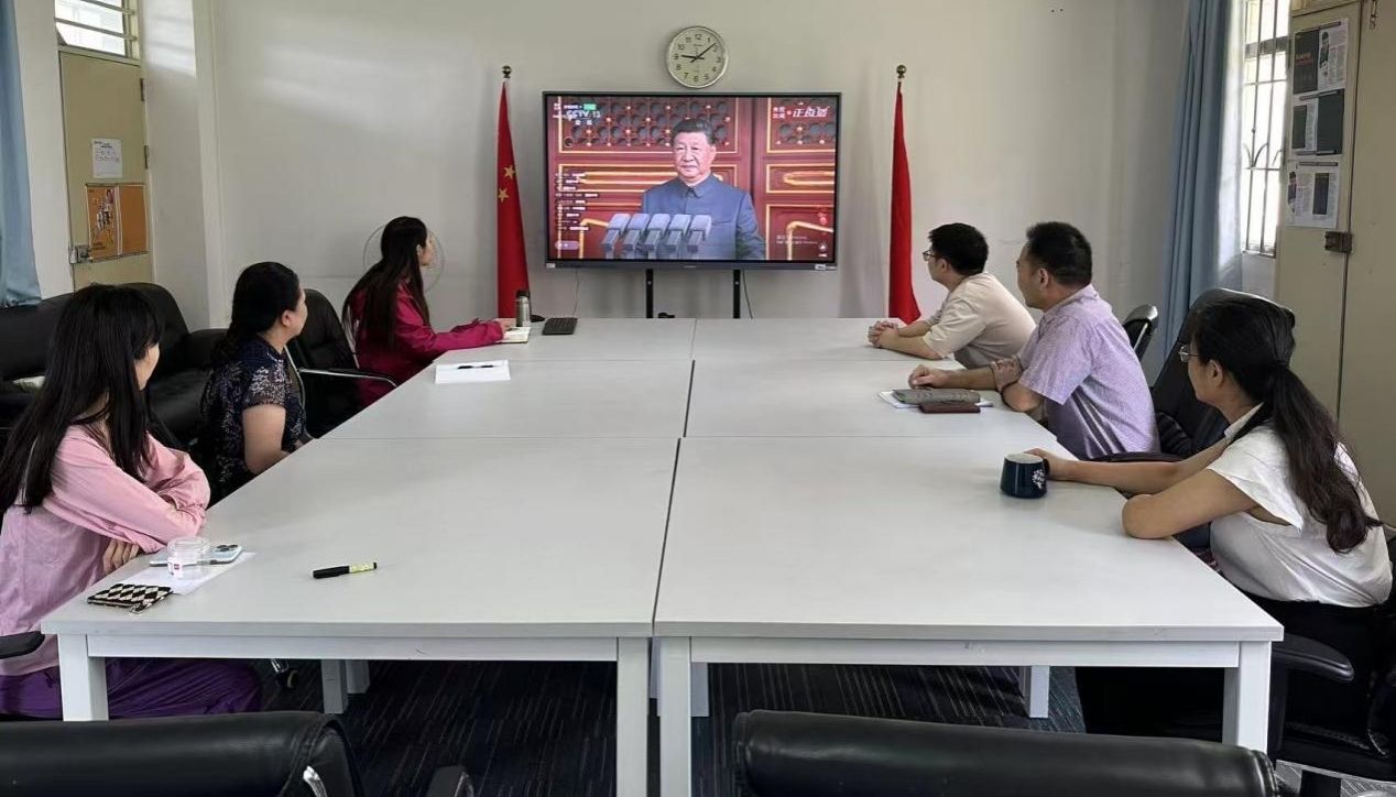 上午9时整,纪念中国人民抗日战争暨世界反法西斯战争胜利80周年阅兵仪式正式开始,与会人员全程观看阅兵活动,隔着屏幕与全国人民共唱国歌。这场阅兵,带来的不仅是一次国力震撼,更是一次跨越时空的承诺。80年来,中国的变化沧海桑田、翻天覆地。在中国共产党的坚强领导下,中国人民创造了“两大奇迹”,成功开辟了中国特色社会主义道路,开创了中国特色社会主义新时代,中华民族迎来了从站起来、富起来到强起来的伟大飞跃,实现中华民族伟大复兴进入了不可逆转的历史进程。一代人有一代人的使命,一代人有一代人的担当。革命先烈为新中国的诞生献出生命,我们要弘扬先烈的英勇献身精神,为建设新时代中国特色社会主义事业添砖加瓦。作为从事国际教育工作的教育工作者,要肩负起引导员工讲好中国故事、传播好中国声音的重任,更要牢记为党育人、为国育才的初心使命。